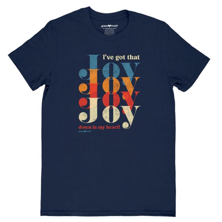 Show em where your joy comes from in this tuneful Joy Joy Joy grace & truth T-Shirt in Navy. When we think of everything the Lord has done for us, how can we help but smile? Written by Methodist Minister, George William Cooke in 1925, the song I ve Got the Joy Joy Joy is a staple of Sunday schools and campfires. We dare you to see this shirt and try not to sing this cheerful tune aloud, if not in your mind.