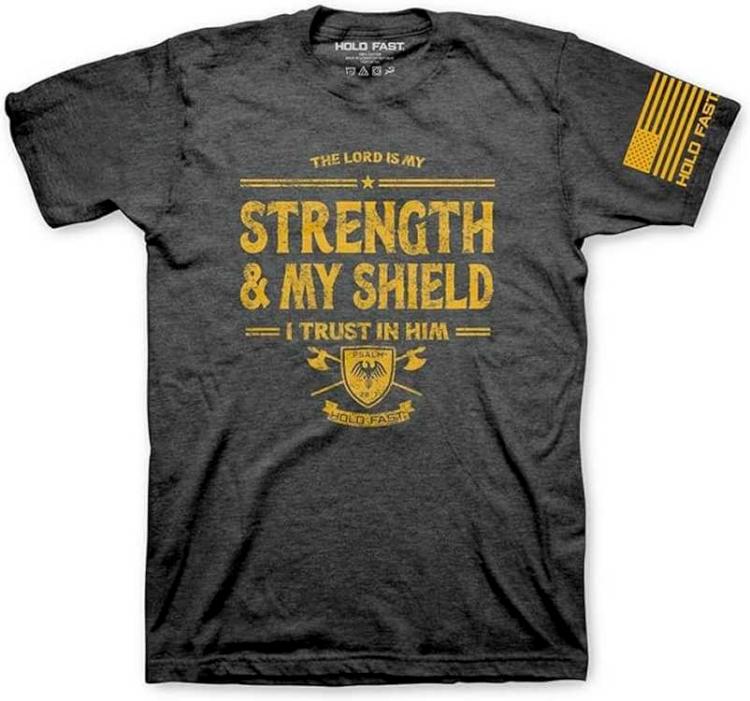 Raise your shield & proclaim your praises to the King in this classic Strength & Shield T-shirt by HOLD FAST in Charcoal Heather. With boldness in your step and joy in your heart, you can approach every battle and conquer any foe, because God goes with you.