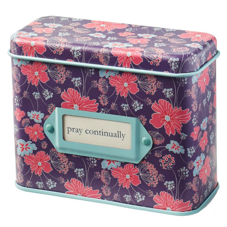 Pink and blue modern flowers sweetly embellish the deep purple exterior of the durable matte tin, while the inside and edging sport a light blue finish. A blue metal label on the front of the tin carries a removable tab printed with the reminder to pray continually. Inside are fifty double-sided cards, each with a theme titled prayer on one side, and a lined space to write out your own prayers.