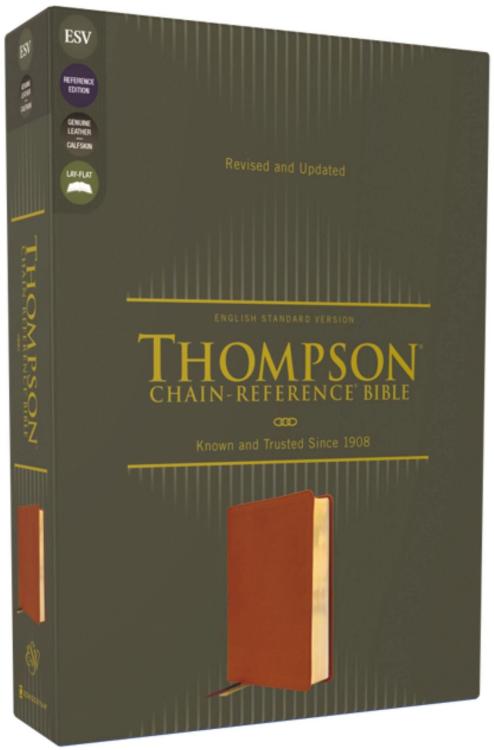 An easy-to-learn, easy-to-use tool for in-depth Bible studyBeloved and acclaimed for more than five generations, the Thompson(R) Chain-Reference(R) Bible is unparalleled in its ability to enrich personal devotions, topical study, and sermon preparation. This unique reference Bible enables you to search the breadth of Scripture’s teachings on thousands of topics and allows you to follow those topics throughout the entire Bible. With over 100,000 references, covering over 8,000 topics, the chain-reference system is an ideal tool for comprehensive topical study. The Thompson Chain-Reference Bible also offers a library of additional study resources that allows readers to interpret the Bible using related scripture passages rather than consulting a commentary.The ESV Thompson Chain-Reference Bible also features a fresh, two-color design that preserves the original look of the chain-reference system, while making each page cleaner and easier to read. Features:Complete text of the English Standard Version (ESV)Easy-to-understand chain-reference system with over 100,000 referencesAlphabetical and numerical indexes highlight study materials for over 8,000 topics, each with its own topic number, for exhaustive topical studyAn extensive study resource section includes biographical sketches, illustrated studies of the Bible, a concordance, Bible harmonies, and many other helpful study toolsFresh, two-color page design66 book introductions16-page full-color map section with map indexLine-matched text for enhanced readabilityWords of Jesus in redPresentation page for gift-givingGilded page edgesRaised spine hubsTwo double-sided satin ribbon markers, each 3/8-inch wideGenuine calfskin leather cover lies flat when openReadable Lexicon typeface9.5-point type size