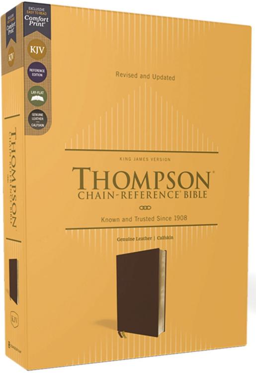 An easy-to-learn, easy-to-use tool for in-depth Bible studyBeloved and acclaimed for more than five generations, the Thompson(R) Chain-Reference(R) Bible is unparalleled in its ability to enrich personal devotions, topical study, and sermon preparation. This unique reference Bible enables you to search the breadth of Scripture’s teachings on thousands of topics and allows you to follow those topics throughout the entire Bible. With over 100,000 references, covering over 8,000 topics, the chain-reference system is an ideal tool for comprehensive topical study. The Thompson Chain-Reference Bible also offers a library of additional study resources that allows readers to interpret the Bible using related scripture passages rather than consulting a commentary.The KJV Thompson Chain-Reference Bible is printed in the KJV Comfort Print(R) typeface for easy reading. Expertly designed specifically to be used for the King James Version (KJV) text, Comfort Print offers an easier reading experience that complements the translation. This Bible also features a fresh, two-color design that preserves the original look of the chain-reference system, while making each page cleaner and easier to read. Features:Complete text of the King James Version (KJV)Easy-to-understand chain-reference system with over 100,000 referencesAlphabetical and numerical indexes highlight study materials for over 8,000 topics, each with its own topic number, for exhaustive topical studyAn extensive study resource section includes biographical sketches, illustrated studies of the Bible, a concordance, Bible harmonies, and many other helpful study toolsFresh, two-color page design66 book introductions16-page full-color map section with map indexLine-matched text for enhanced readabilityWords of Jesus in redPresentation page for gift-givingArt gilded page edgesRaised spine hubsTwo double-sided satin ribbon markers, each 3/8-inch wideGenuine calfskin leather cover lies flat when openThumb indexed to make finding the books of the Bible easierExclusive KJV Comfort Print typefacePrint size: 9.5