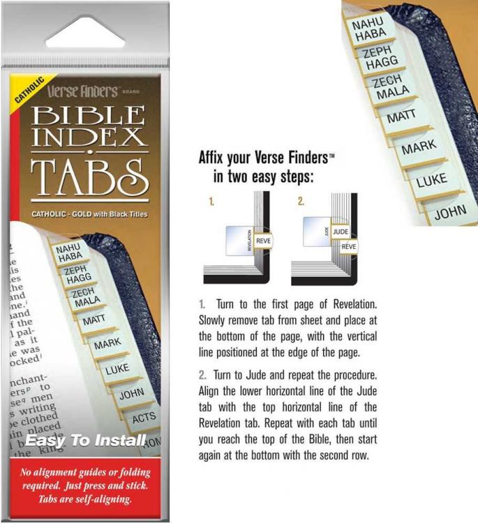 $5.99Features: Easy to install – no alignment guides or folding required. Just press and stick. Tabs are self-aligning. Index your Bible in minutes…not hours. Attractive and durable for years of trouble-free use. Horizontal style – reads left to right. Compact 3/8″ design indexes a standard Bible in only 2 rows, making books easier to find.
