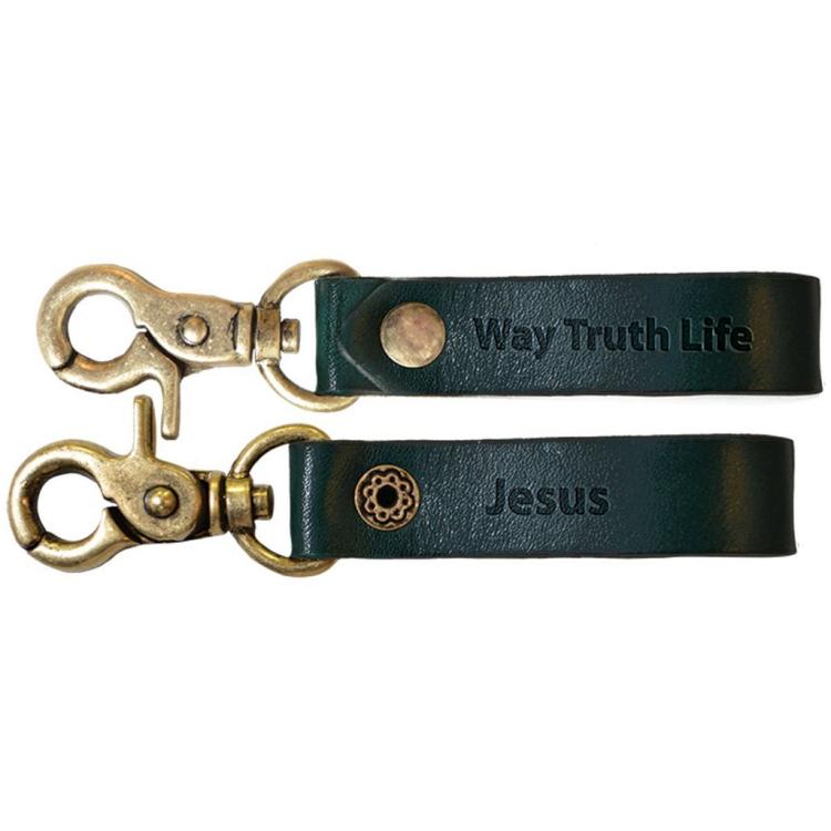 Speak the name of Jesus over your day with this Way Truth Life Guy s Leather Keychain by Faith Gear on your belt, backpack, or duffel bag. With a convenient lobster swivel clasp and genuine Dark Green leather, one side is stamped with Way Truth Life, the other with Jesus. It s a handy dose of encouragement every time you pick up your keys.
